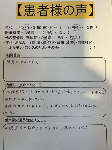 軽いギックリ腰で来院されて一回の治療と生活指導でかなり改善されて、メンテナンスと健康について学ぶと良いとお伝えしました!ストレッチや生活改善で若々しい身体になっていきました。すると患者さんから実は耳鳴りがあったのですが最近無いんですと!バランス整骨院は木を見て森を見ずではなく、木も森も両方診る事を心がけています。そして症状だけではなく患者さんの人生や未来が豊かになるようエネルギーを注いでいます。治療技術の向上にゴールは無いので日々研鑽して頑張ります