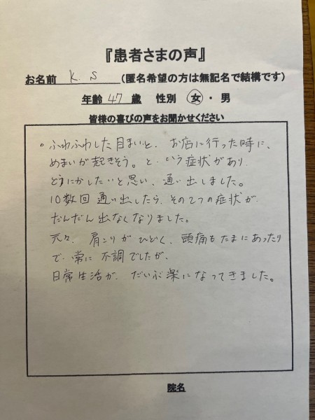 トップページ お知らせ一覧 患者さまの声、フワフワしためまいが!